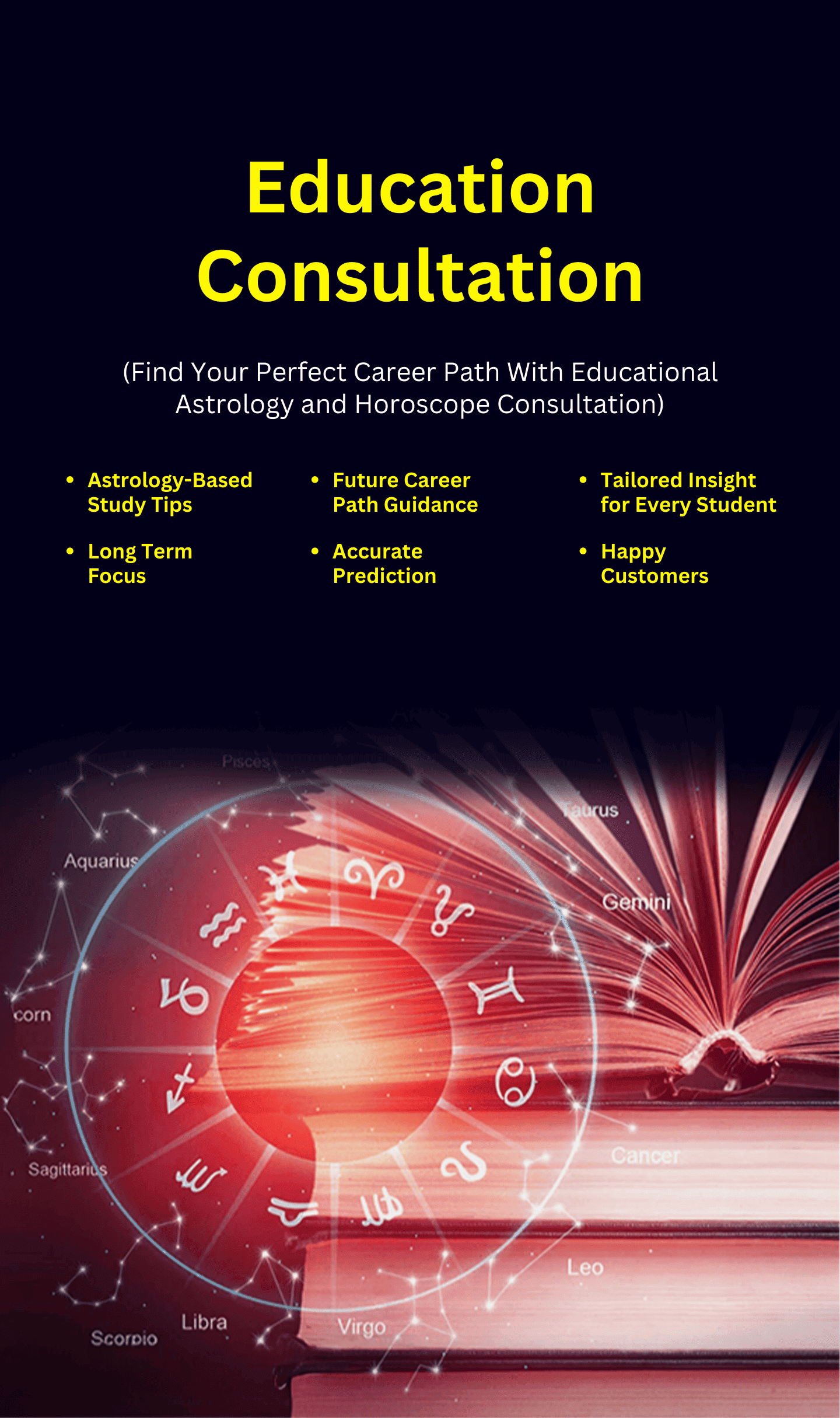 Educational astrology consultation, similar to Kundli matching, involves analyzing various factors in your horoscope to understand your strengths and challenges in academics. The key attributes of your educational potential, like intelligence, focus, and career prospects, are assessed through your birth chart. Astrologers recommend a suitable educational path when at least 50% of these key attributes align, helping you make the right decisions for your future.
