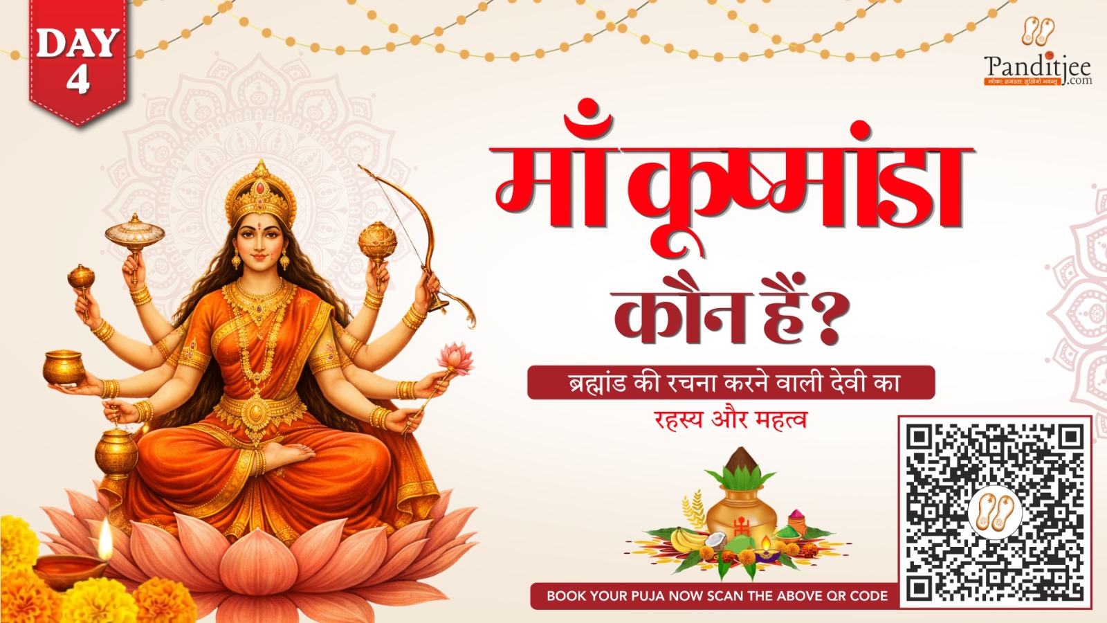 नवरात्रि का चौथा दिन माँ कूष्मांडा को समर्पित होता है, जो माँ दुर्गा का चौथा स्वरूप हैं। उन्हें सृष्टि की रचयिता और समस्त ब्रह्मांड की ऊर्जा का स्रोत माना जाता है।