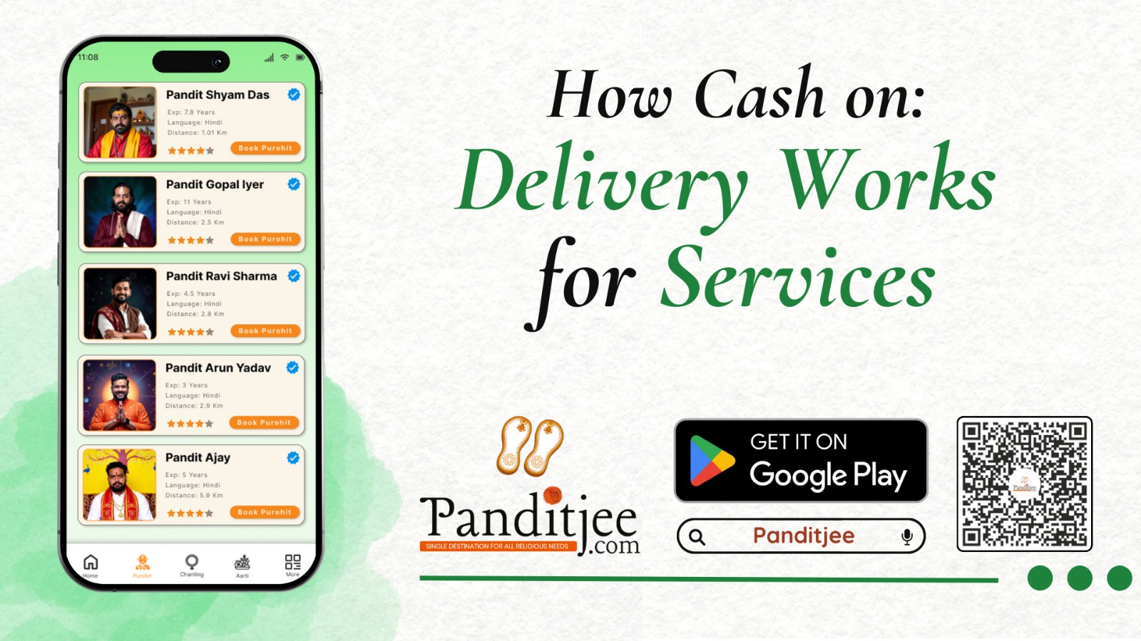 Panditjee.com समझता है कि कुछ भक्त सेवा पूरी होने के बाद ही नकद भुगतान करना पसंद करते हैं। इसी कारण से ऐप पर योग्य सेवाओं और क्षेत्रों के लिए कैश ऑन डिलीवरी (सीओडी) का विकल्प भी उपलब्ध है।