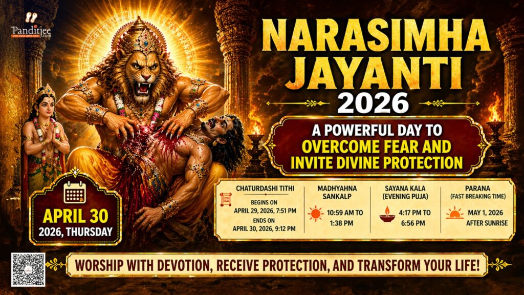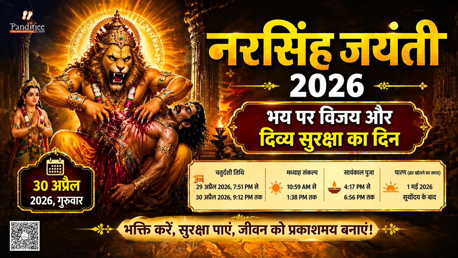 नरसिंह जयंती हिंदू धर्म का एक अत्यंत शक्तिशाली और पवित्र पर्व है, जो भगवान विष्णु के चौथे अवतार, भगवान नरसिंह को समर्पित है। यह दिन उस दिव्य घटना की याद दिलाता है जब भगवान विष्णु ने आधे मनुष्य और आधे सिंह के रूप में प्रकट होकर अपने भक्त प्रह्लाद की रक्षा की और दुष्ट हिरण्यकशिपु का वध किया। वर्ष 2026 में नरसिंह जयंती 30 अप्रैल को मनाई जाएगी।