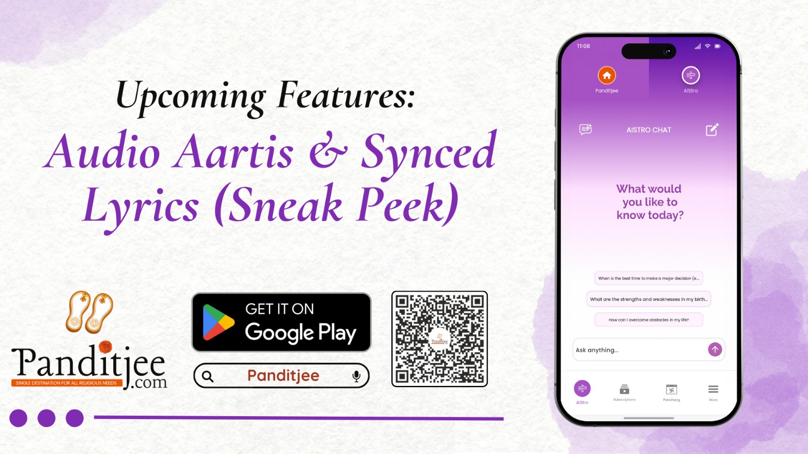 Panditjee.com apne spiritual content ko continuously enhance kar raha hai. Jaldi hi ek exciting feature launch hoga—Audio Aartis with Synced Lyrics.